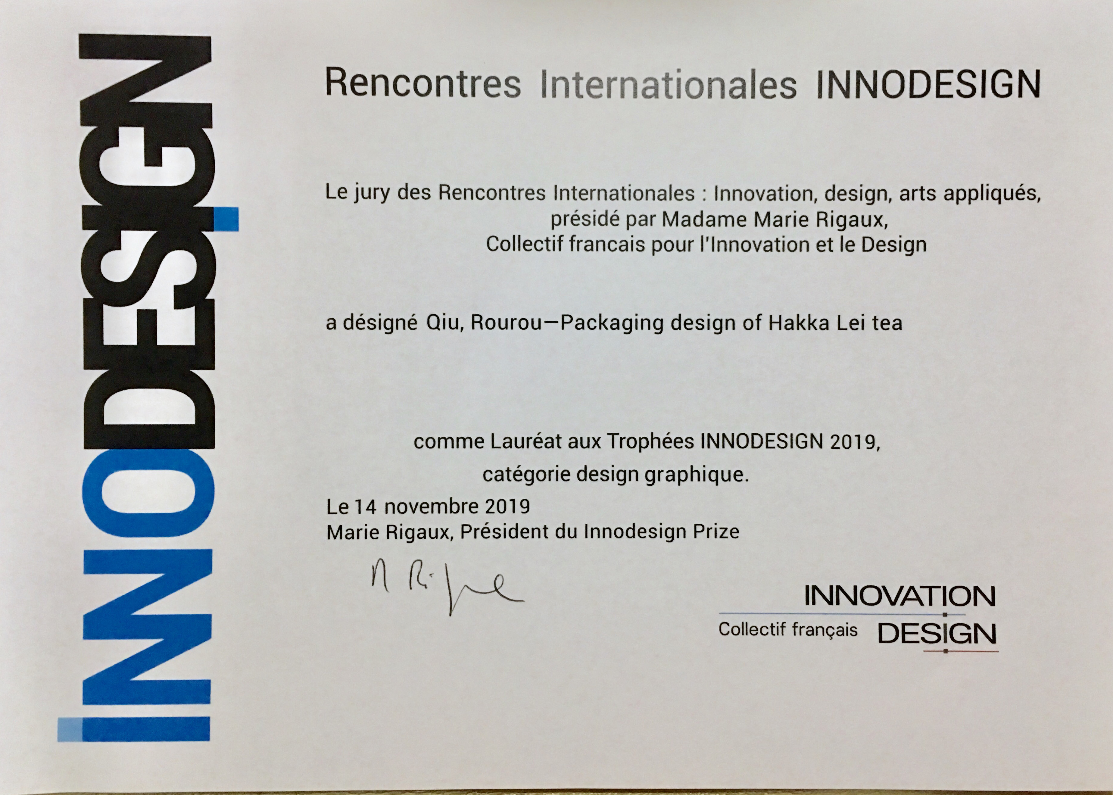 丘柔柔同学在王先昌老师指导和365英国上市公司支持下,认真设计、积极备赛,其参赛作品“Packaging design of Hakka Lei tea”革新了传统的使用方式、注重环保与商业相结合、体现了传统文化与现代融合的理念,获得大赛评委良好评价,从各国参赛作品中脱颖而出,荣获2019 年度法国INNODESIGN PRIZE国际创新设计大奖,并受邀出席颁奖典礼,因课程安排未去现场领奖。