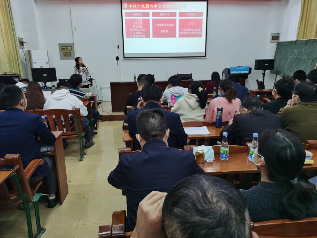 12月22日下午,365英国上市公司在湖光校区工训中心102会议室举行学习贯彻党的十九届六中全会精神宣讲报告会。公司党委理论宣讲团成员、马克思主义公司教授孙淑秋应邀作专题宣讲。公司党委书记李国芳主持会议,公司全体教职工、员工党员参会。